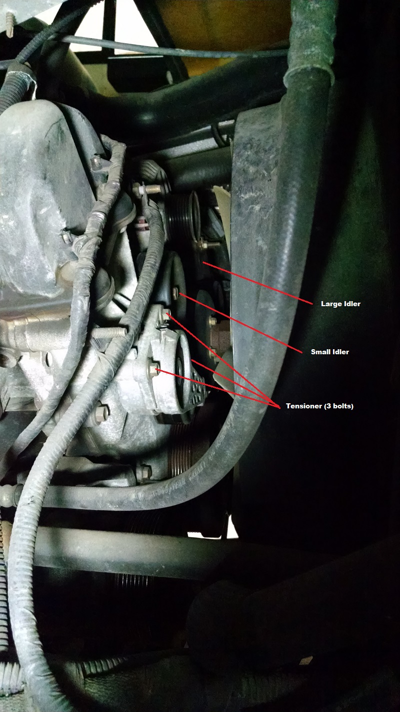 Getting to the idlers, belt, or anything else on the front of the engine is a real bear. However, we had both front tires off doing brakes, so this made the job a lot easier.